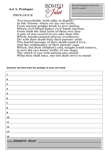 Romeo And Juliet Prologue Worksheet. In this activity, students read the Prologue to Shakespeare's Romeo and Juliet. From forth the fatal loins of these two foes A pair of star-cross'd lovers take their life; Whose misadventured piteous.