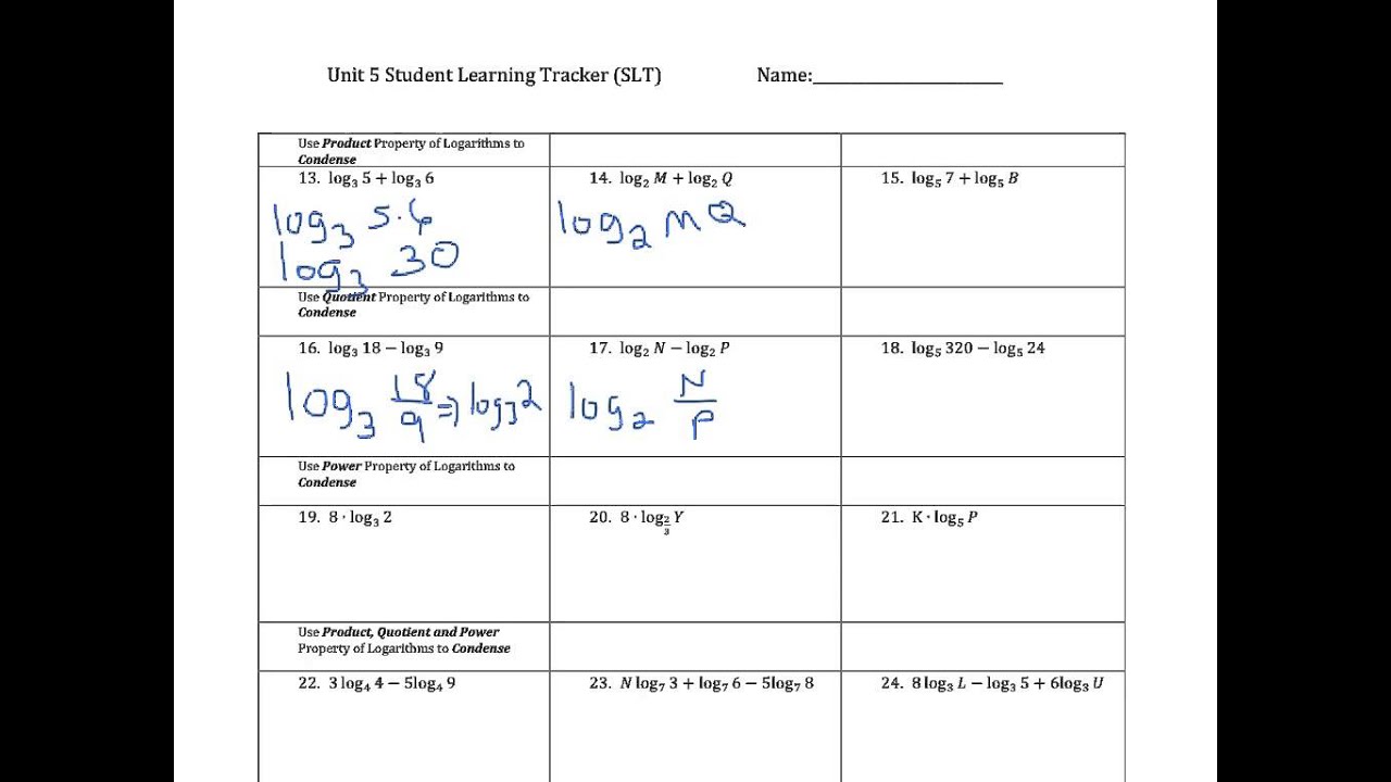 When you are asked to expand log expressions, your goal is to express a single logarithmic expression into many individual parts or components. The student answer sheet is "blank" instead of me labeli Some of the worksheets displayed are Properties of logarithms, Name date score, Expanding and condensing logarithms, Name date score, Logarithms expand condense properties equations, Properties of logarithms condensing logarithms, Expanding and condensing, Meaning of logarithms. Some of the worksheets displayed are Logarithms expand condense properties equations, Properties of logarithms, Name date score, Properties of logarithms condensing logarithms, Logarithms and their properties plus practice, Expanding and condensing logarithms, Properties of logarithms, Work logarithmic function.